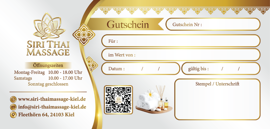 Bereiten Sie Ihren Liebsten eine besondere Freude mit einem Gutschein für wohltuende Thai-Massagen. Ob zum Geburtstag, zum Valentinstag oder als kleines Dankeschön – ein Massagegutschein ist ein Geschenk, das Entspannung und Wohlbefinden schenkt. Erhältlich mit frei wählbarem Wert oder für ausgewählte Behandlungen.