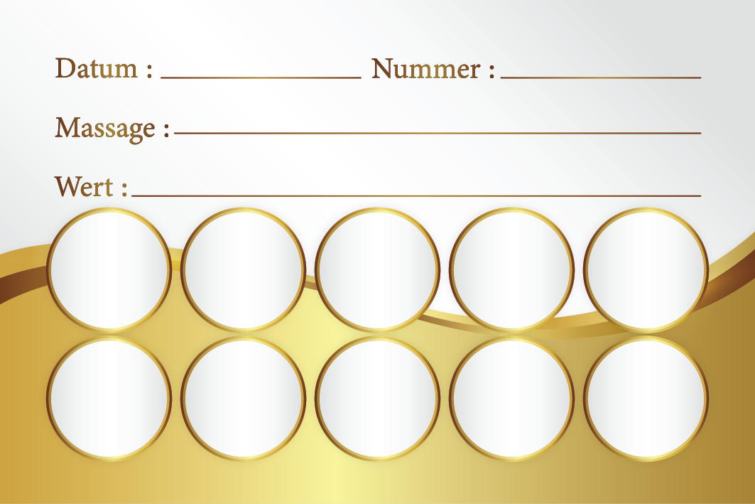 Wir schätzen unsere Stammkunden sehr. Bei jedem Besuch ab 60 Minuten erhalten Sie einen Treue-Stempel auf Ihrer persönlichen Bonuskarte. Sobald Ihre Karte vollständig ist (10 Stempel), schenken wir Ihnen eine Massage als Dankeschön. Sprechen Sie uns gerne bei Ihrem nächsten Termin an.